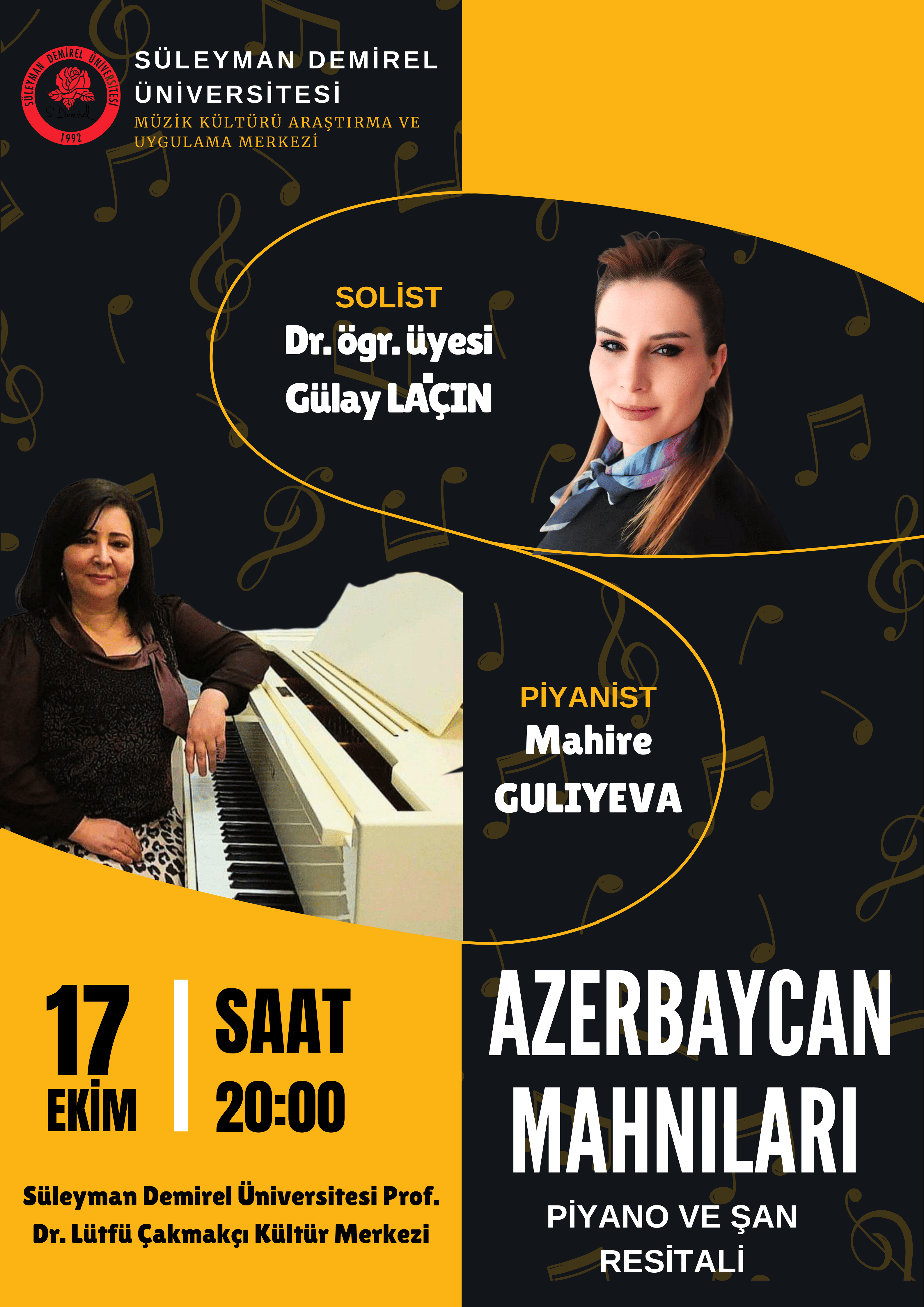 SDÜ Müzik Kültürü Araştırma ve Uygulama Merkezi tarafından düzenlenen, Dr. Öğretim Üyesi Gülay Laçin’ın solist, Mahire Guliyeva’nın piyanist olarak yer alacağı “Azerbaycan Mahnıları” konseri, 17 Ekim Cuma günü saat 20.00’de Prof. Dr. M. Lütfü Çakmakçı Kültür Merkezi’nde gerçekleştirilecektir.